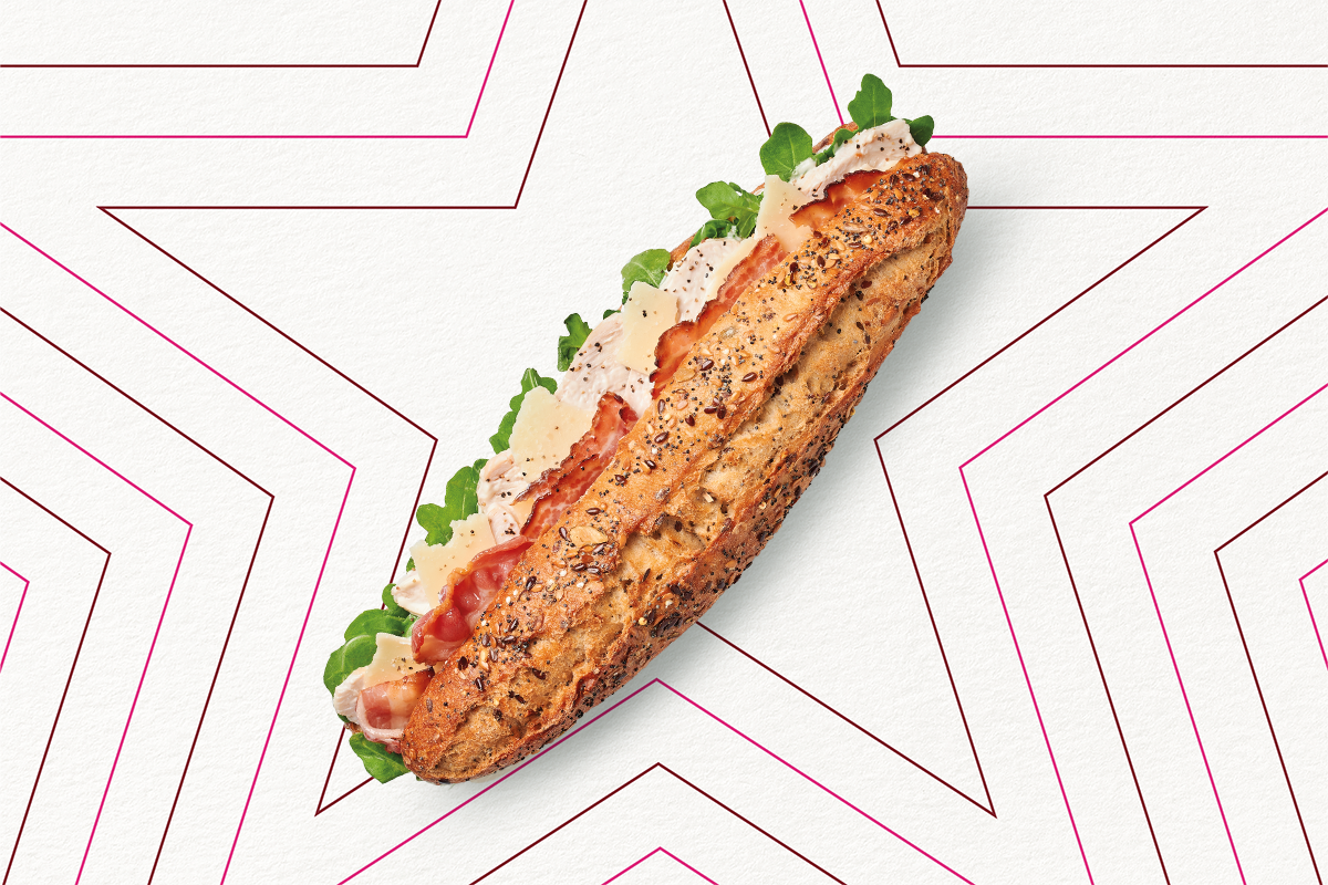 In einem Körnerbaguette servieren wir Hähnchenbrustfilets mit Caesar-Sauce, Speckscheiben aus Großbritannien, Rucolablättern und Parmesan.