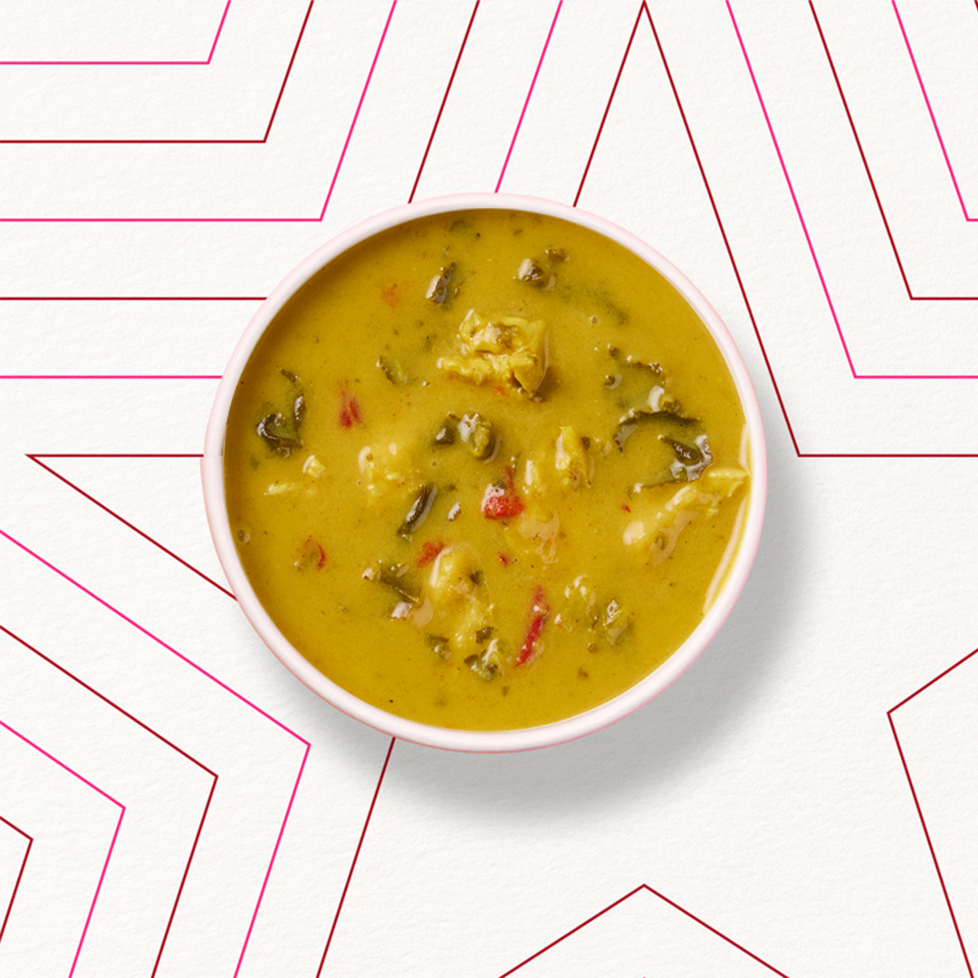 Kokosmilchsuppe mit Hühnerfleisch, Shiitakepilzen, Garnelen, Zwiebeln und rotem Paprika, gewürzt mit Ingwer, Zitronengras, Limette und einer Prise Chili.
