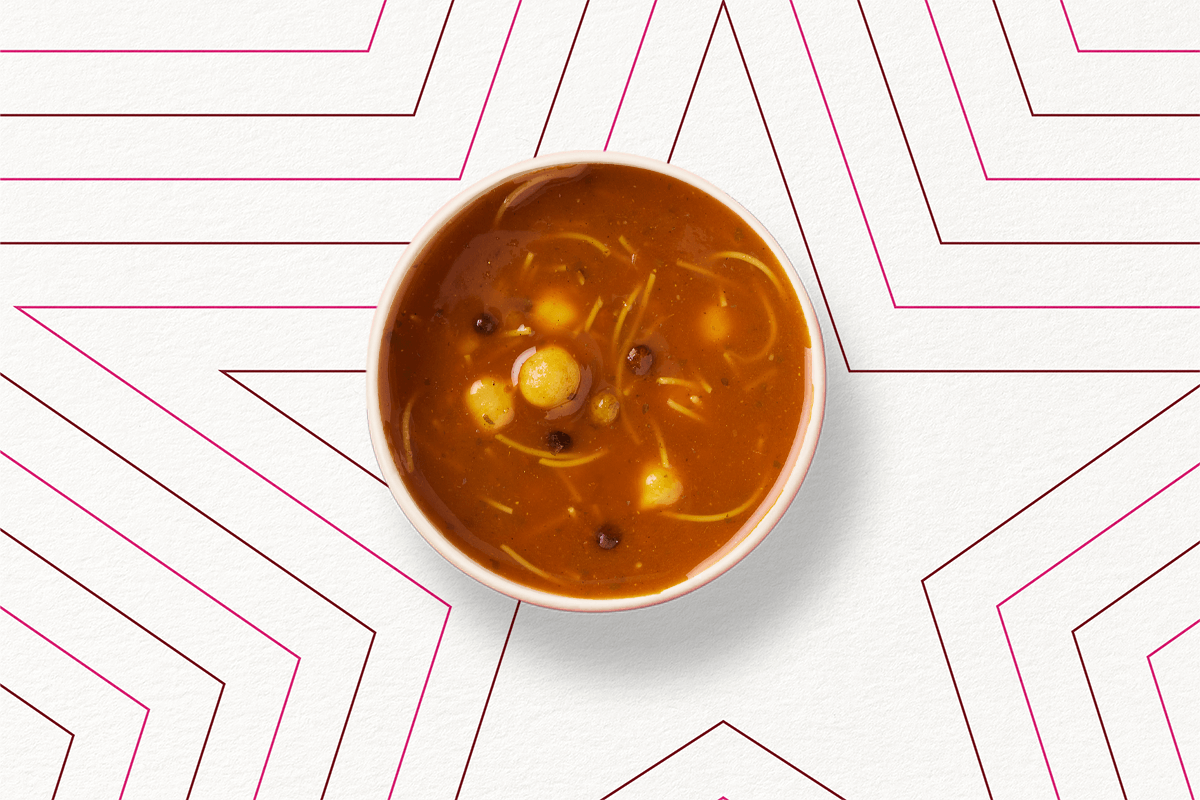 Vegane Harira-Suppe mit Tomate, grünen Linsen, Zwiebeln und Kichererbsen, Reisfadennudeln, verfeinert mit Pfefferminze, Koriander und milden Gewürzen.